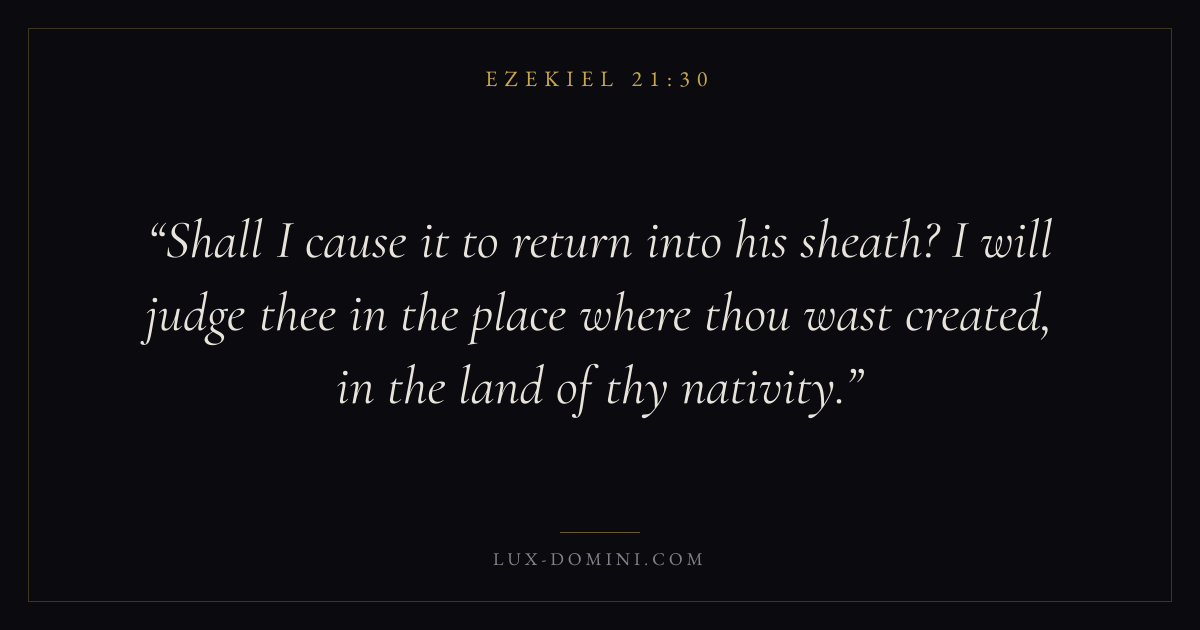 Shall I cause it to return into his sheath? I will judge thee in the place where thou wast created, in the land of thy nativity.
