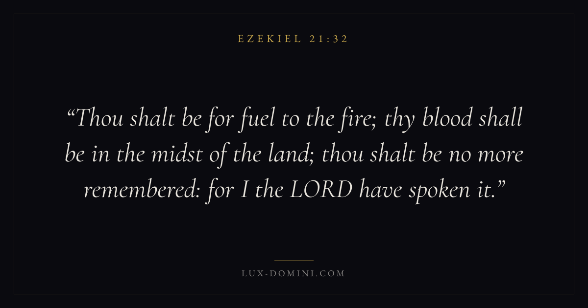 Thou shalt be for fuel to the fire; thy blood shall be in the midst of the land; thou shalt be no more remembered: for I the LORD have spoken it.