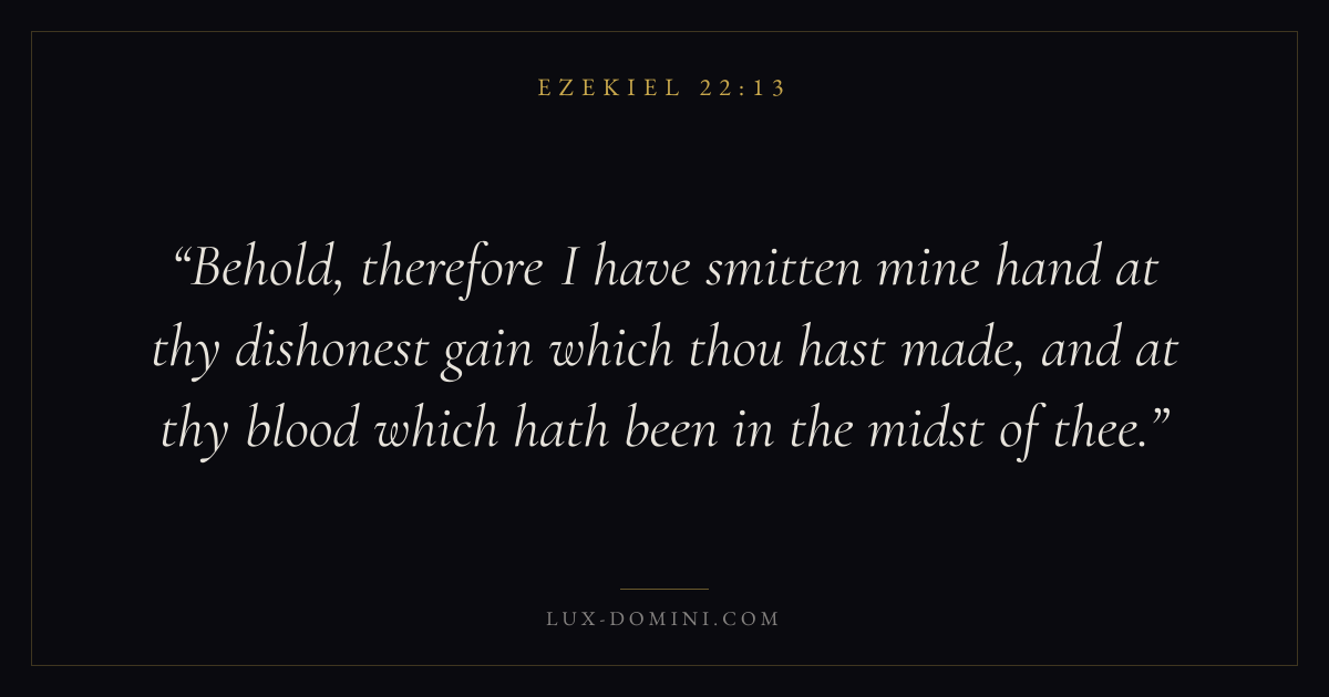 Behold, therefore I have smitten mine hand at thy dishonest gain which thou hast made, and at thy blood which hath been in the midst of thee.