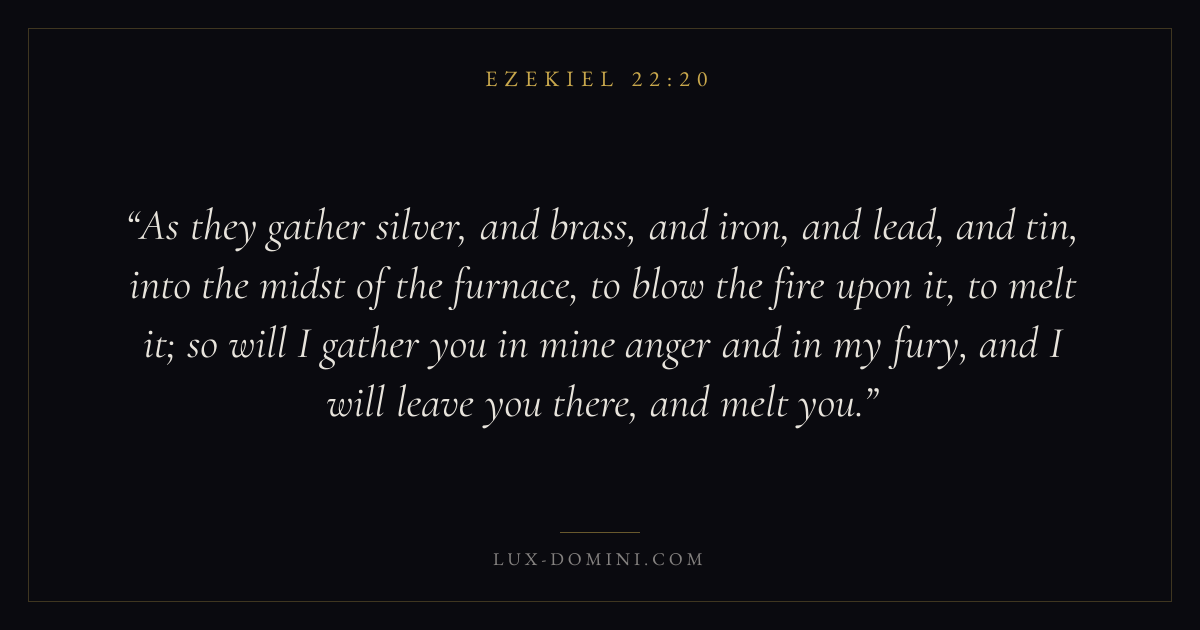 As they gather silver, and brass, and iron, and lead, and tin, into the midst of the furnace, to blow the fire upon it, to melt it; so will I gather you in mine anger and in my fury, and I will leave you there, and melt you.