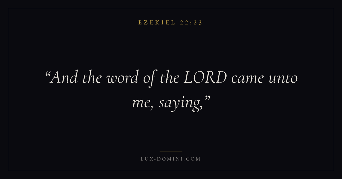 Books / Ezekiel / Chapter 22 / Verse 23 ← Ezekiel 22:22 Ezekiel 22:23 Ezekiel 22:24 → And the word of the LORD came unto me, saying, Download verse card Share on Twitter Share on Facebook Pin it ✦ Key themes Justice and mercyTruthGlory of GodJudgment Read with Ezekiel 22:24Micah 6:8Amos 5:24John 14:6 Related topics Bible verses about justice and mercyBible verses about truth ✦ Ezekiel Chapter 22 verses V. 1 V. 2 V. 3 V. 4 V. 5 V. 6 V. 7 V. 8 V. 9 V. 10 V. 11 V. 12 V. 13 V. 14 V. 15 V. 16 V. 17 V. 18 V. 19 V. 20 V. 21 V. 22 V. 23 V. 24 V. 25 V. 26 V. 27 V. 28 V. 29 V. 30 V. 31