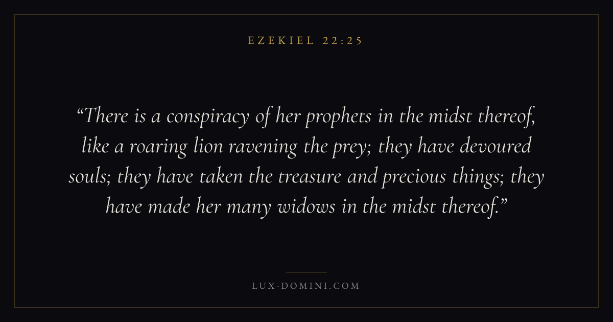 There is a conspiracy of her prophets in the midst thereof, like a roaring lion ravening the prey; they have devoured souls; they have taken the treasure and precious things; they have made her many widows in the midst thereof.