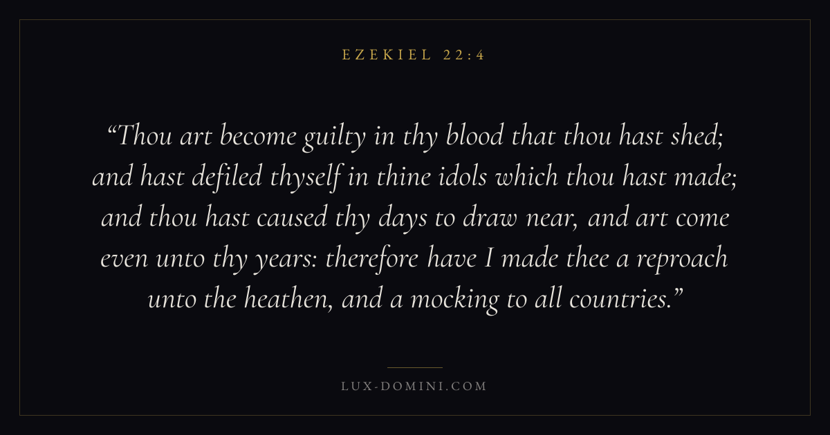 Thou art become guilty in thy blood that thou hast shed; and hast defiled thyself in thine idols which thou hast made; and thou hast caused thy days to draw near, and art come even unto thy years: therefore have I made thee a reproach unto the heathen, and a mocking to all countries.