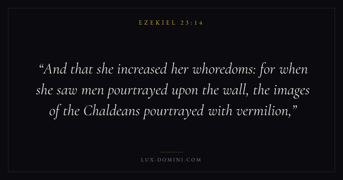 And that she increased her whoredoms: for when she saw men pourtrayed upon the wall, the images of the Chaldeans pourtrayed with vermilion,