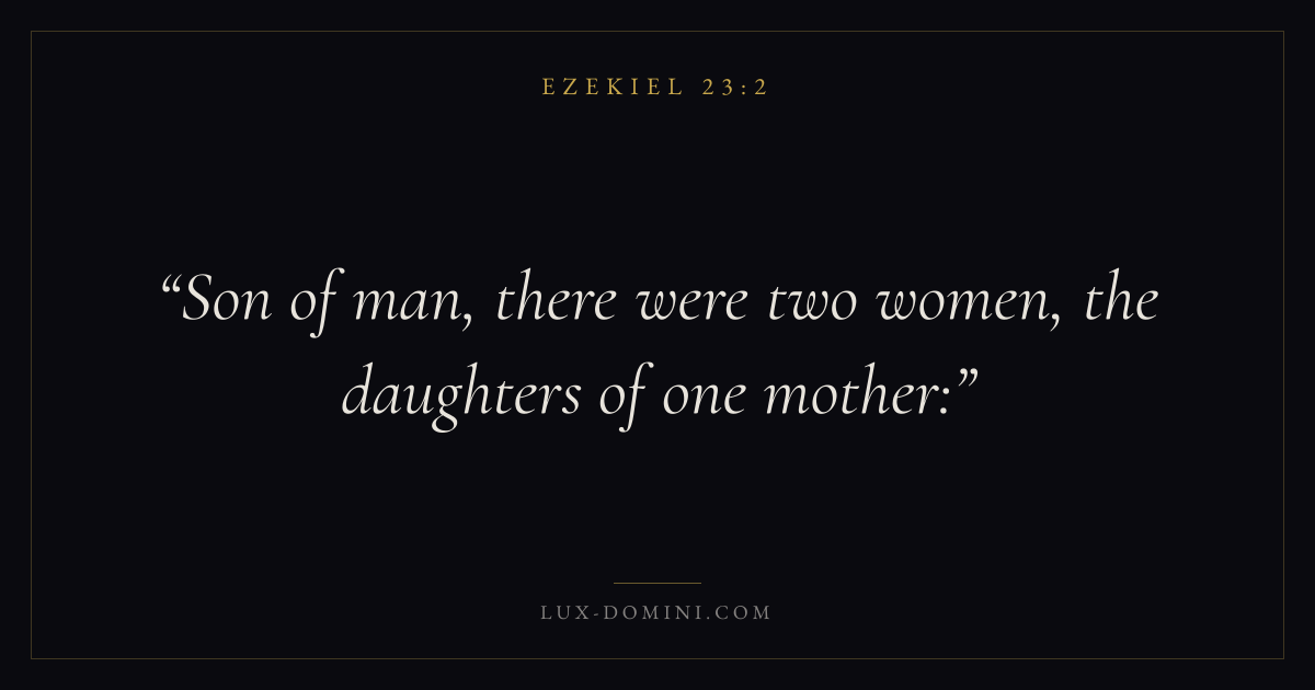 Books / Ezekiel / Chapter 23 / Verse 2 ← Ezekiel 23:1 Ezekiel 23:2 Ezekiel 23:3 → Son of man, there were two women, the daughters of one mother: Download verse card Share on Twitter Share on Facebook Pin it ✦ Key themes Justice and mercyGlory of GodJudgmentExile Read with Ezekiel 23:1Ezekiel 23:3Micah 6:8Amos 5:24 Related topics Bible verses about justice and mercy ✦ Ezekiel Chapter 23 verses V. 1 V. 2 V. 3 V. 4 V. 5 V. 6 V. 7 V. 8 V. 9 V. 10 V. 11 V. 12 V. 13 V. 14 V. 15 V. 16 V. 17 V. 18 V. 19 V. 20 V. 21 V. 22 V. 23 V. 24 V. 25 V. 26 V. 27 V. 28 V. 29 V. 30 V. 31 V. 32 V. 33 V. 34 V. 35 V. 36 V. 37 V. 38 V. 39 V. 40 V. 41 V. 42 V. 43 V. 44 V. 45 V. 46 V. 47 V. 48 V. 49