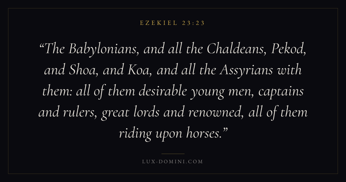 The Babylonians, and all the Chaldeans, Pekod, and Shoa, and Koa, and all the Assyrians with them: all of them desirable young men, captains and rulers, great lords and renowned, all of them riding upon horses.