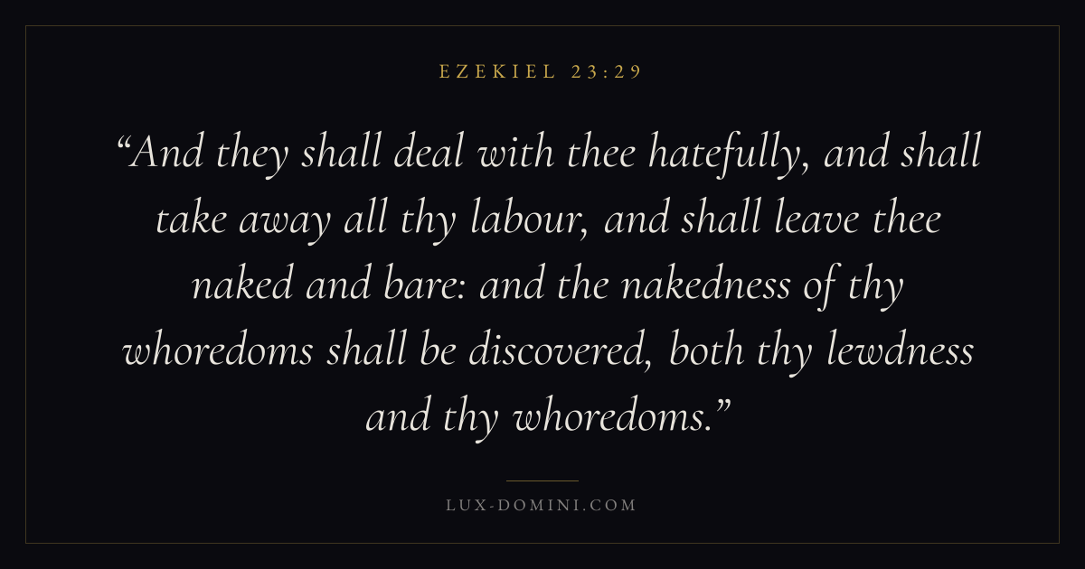 And they shall deal with thee hatefully, and shall take away all thy labour, and shall leave thee naked and bare: and the nakedness of thy whoredoms shall be discovered, both thy lewdness and thy whoredoms.