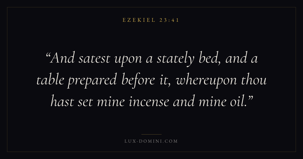 And satest upon a stately bed, and a table prepared before it, whereupon thou hast set mine incense and mine oil.