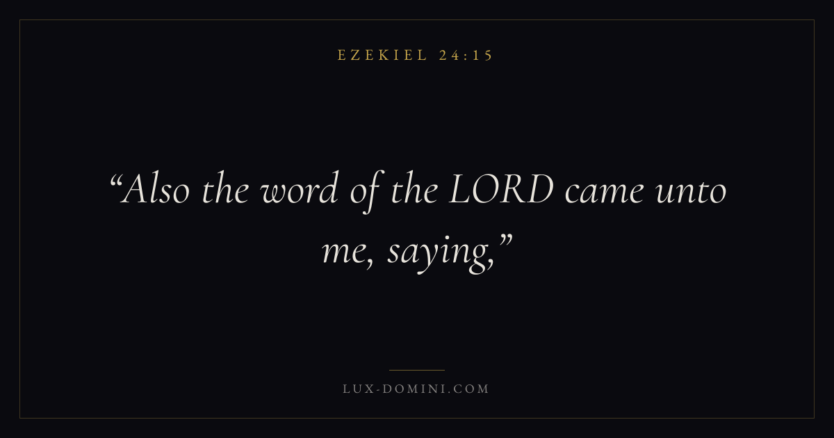 Books / Ezekiel / Chapter 24 / Verse 15 ← Ezekiel 24:14 Ezekiel 24:15 Ezekiel 24:16 → Also the word of the LORD came unto me, saying, Download verse card Share on Twitter Share on Facebook Pin it ✦ Key themes HopeJustice and mercyTruthGlory of God Read with Ezekiel 24:16Ezekiel 24:17Romans 8:24Revelation 21:4 Related topics Bible verses about hopeBible verses about justice and mercyBible verses about truth ✦ Ezekiel Chapter 24 verses V. 1 V. 2 V. 3 V. 4 V. 5 V. 6 V. 7 V. 8 V. 9 V. 10 V. 11 V. 12 V. 13 V. 14 V. 15 V. 16 V. 17 V. 18 V. 19 V. 20 V. 21 V. 22 V. 23 V. 24 V. 25 V. 26 V. 27