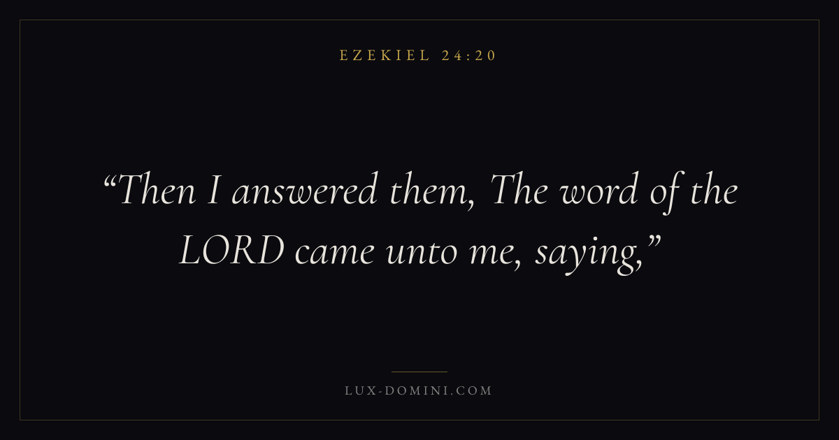 Books / Ezekiel / Chapter 24 / Verse 20 ← Ezekiel 24:19 Ezekiel 24:20 Ezekiel 24:21 → Then I answered them, The word of the LORD came unto me, saying, Download verse card Share on Twitter Share on Facebook Pin it ✦ Key themes HopeJustice and mercyTruthGlory of God Read with Ezekiel 24:19Ezekiel 24:21Romans 8:24Revelation 21:4 Related topics Bible verses about hopeBible verses about justice and mercyBible verses about truth ✦ Ezekiel Chapter 24 verses V. 1 V. 2 V. 3 V. 4 V. 5 V. 6 V. 7 V. 8 V. 9 V. 10 V. 11 V. 12 V. 13 V. 14 V. 15 V. 16 V. 17 V. 18 V. 19 V. 20 V. 21 V. 22 V. 23 V. 24 V. 25 V. 26 V. 27