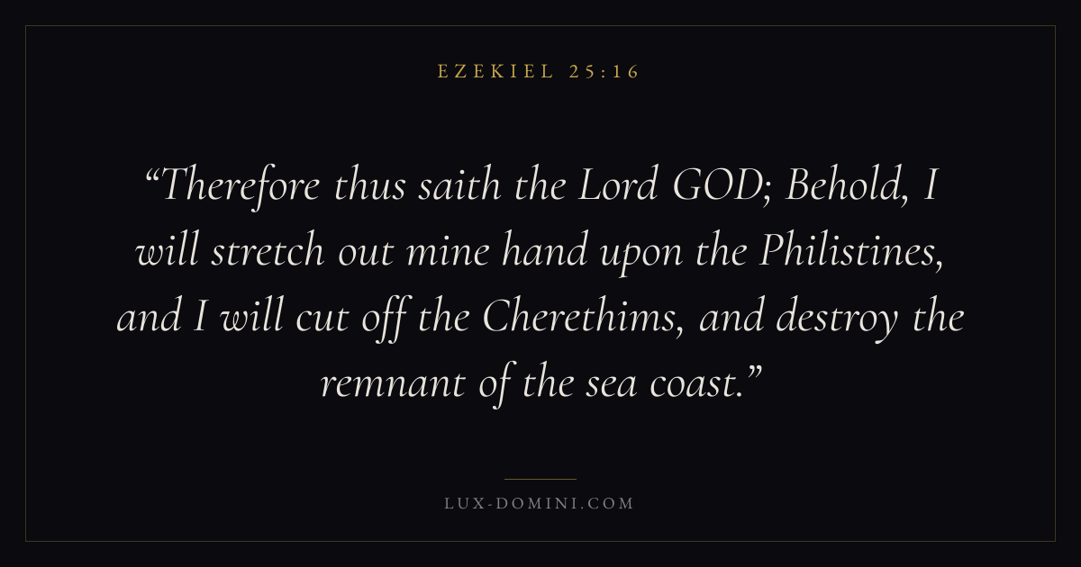 Therefore thus saith the Lord GOD; Behold, I will stretch out mine hand upon the Philistines, and I will cut off the Cherethims, and destroy the remnant of the sea coast.