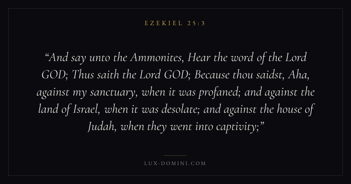 And say unto the Ammonites, Hear the word of the Lord GOD; Thus saith the Lord GOD; Because thou saidst, Aha, against my sanctuary, when it was profaned; and against the land of Israel, when it was desolate; and against the house of Judah, when they went into captivity;
