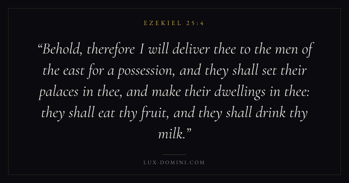 Behold, therefore I will deliver thee to the men of the east for a possession, and they shall set their palaces in thee, and make their dwellings in thee: they shall eat thy fruit, and they shall drink thy milk.