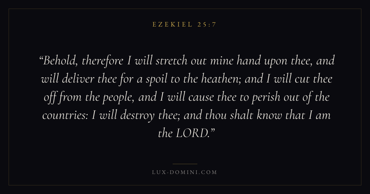 Behold, therefore I will stretch out mine hand upon thee, and will deliver thee for a spoil to the heathen; and I will cut thee off from the people, and I will cause thee to perish out of the countries: I will destroy thee; and thou shalt know that I am the LORD.