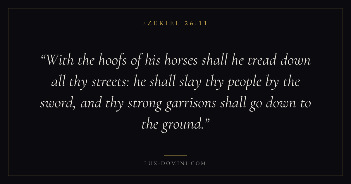 With the hoofs of his horses shall he tread down all thy streets: he shall slay thy people by the sword, and thy strong garrisons shall go down to the ground.