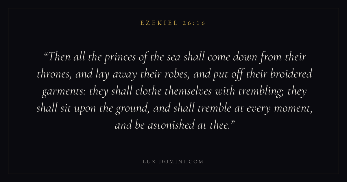 Then all the princes of the sea shall come down from their thrones, and lay away their robes, and put off their broidered garments: they shall clothe themselves with trembling; they shall sit upon the ground, and shall tremble at every moment, and be astonished at thee.