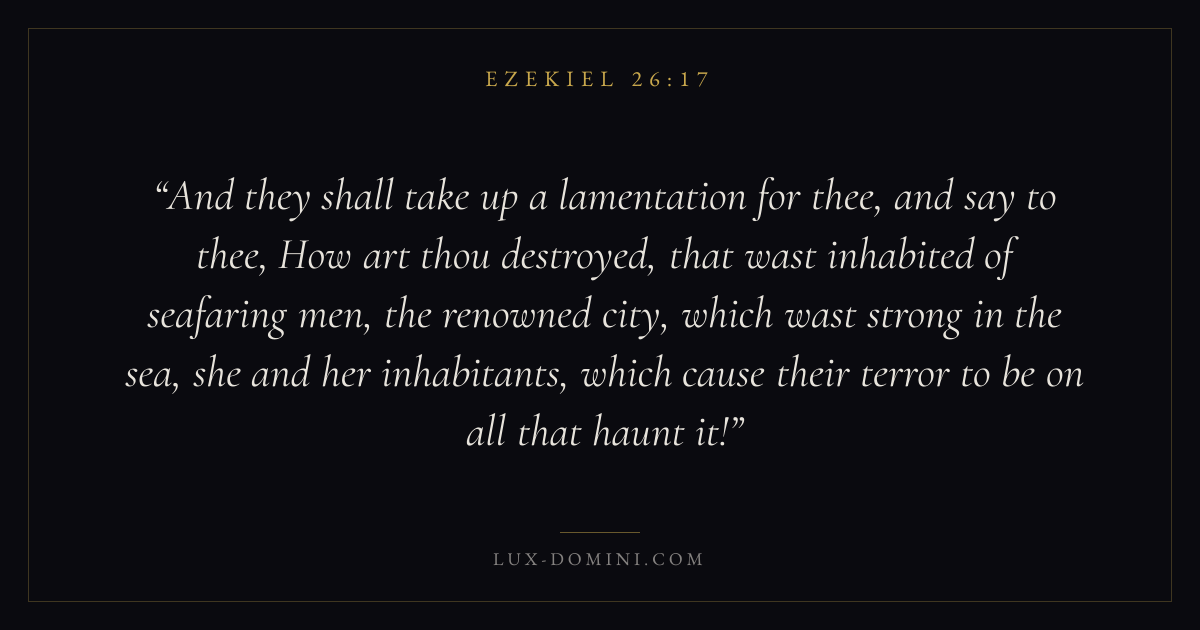 And they shall take up a lamentation for thee, and say to thee, How art thou destroyed, that wast inhabited of seafaring men, the renowned city, which wast strong in the sea, she and her inhabitants, which cause their terror to be on all that haunt it!