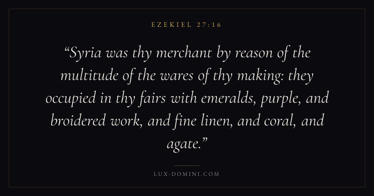 Syria was thy merchant by reason of the multitude of the wares of thy making: they occupied in thy fairs with emeralds, purple, and broidered work, and fine linen, and coral, and agate.