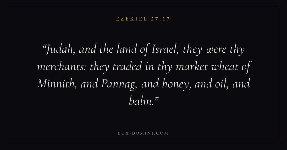 Judah, and the land of Israel, they were thy merchants: they traded in thy market wheat of Minnith, and Pannag, and honey, and oil, and balm.