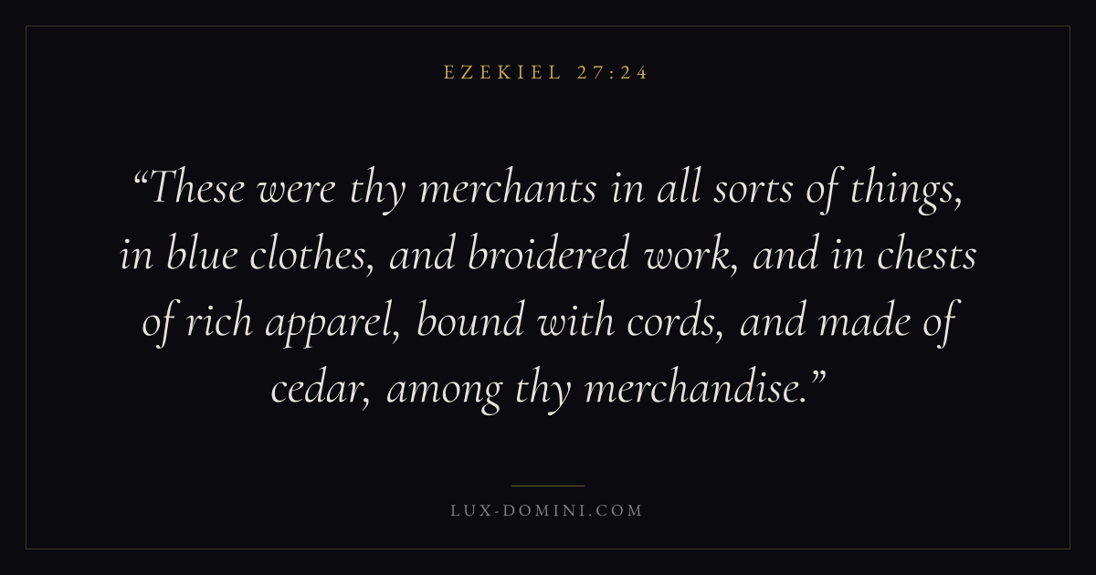 These were thy merchants in all sorts of things, in blue clothes, and broidered work, and in chests of rich apparel, bound with cords, and made of cedar, among thy merchandise.