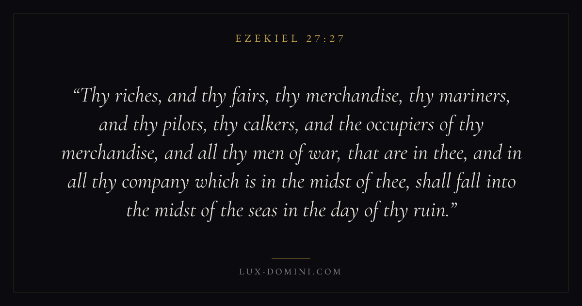 Thy riches, and thy fairs, thy merchandise, thy mariners, and thy pilots, thy calkers, and the occupiers of thy merchandise, and all thy men of war, that are in thee, and in all thy company which is in the midst of thee, shall fall into the midst of the seas in the day of thy ruin.