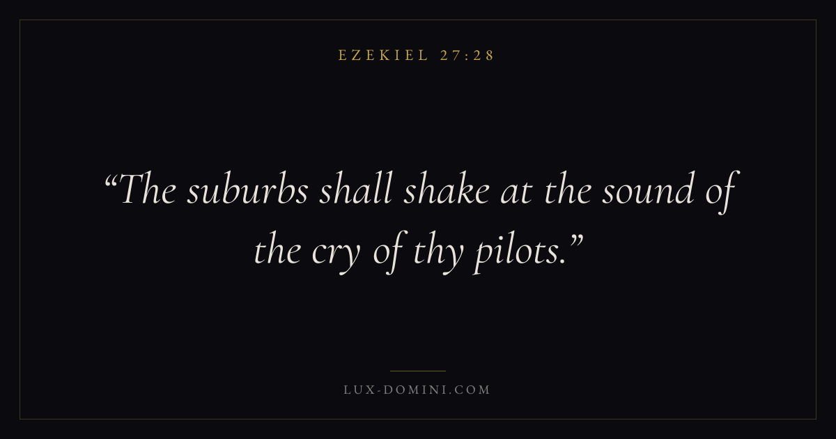 Books / Ezekiel / Chapter 27 / Verse 28 ← Ezekiel 27:27 Ezekiel 27:28 Ezekiel 27:29 → The suburbs shall shake at the sound of the cry of thy pilots. Download verse card Share on Twitter Share on Facebook Pin it ✦ Key themes HopeJustice and mercyPeaceGlory of God Read with Ezekiel 27:29Ezekiel 27:30Romans 8:24Revelation 21:4 Related topics Bible verses about hopeBible verses about justice and mercyBible verses about peace ✦ Ezekiel Chapter 27 verses V. 1 V. 2 V. 3 V. 4 V. 5 V. 6 V. 7 V. 8 V. 9 V. 10 V. 11 V. 12 V. 13 V. 14 V. 15 V. 16 V. 17 V. 18 V. 19 V. 20 V. 21 V. 22 V. 23 V. 24 V. 25 V. 26 V. 27 V. 28 V. 29 V. 30 V. 31 V. 32 V. 33 V. 34 V. 35 V. 36