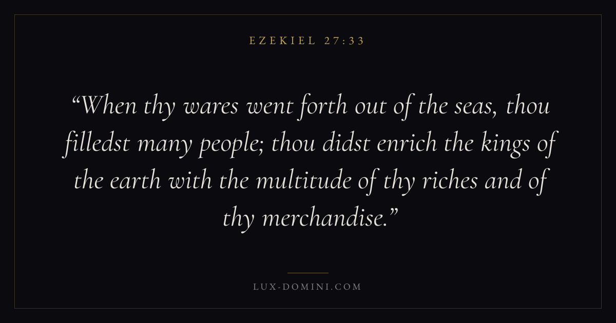 When thy wares went forth out of the seas, thou filledst many people; thou didst enrich the kings of the earth with the multitude of thy riches and of thy merchandise.