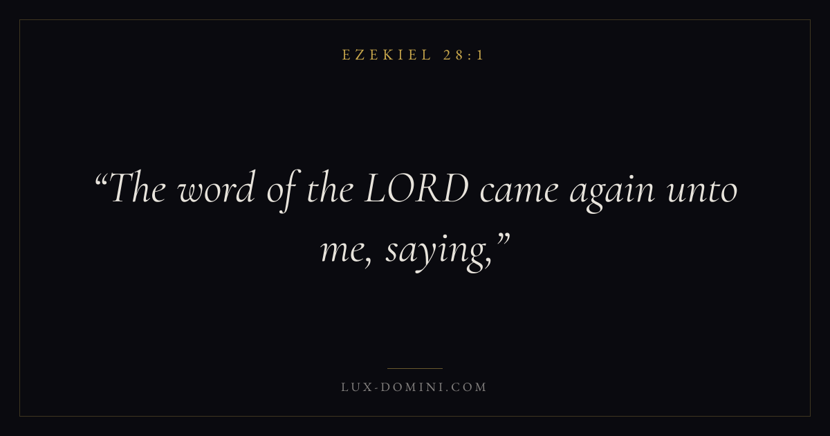 Books / Ezekiel / Chapter 28 / Verse 1 ← Ezekiel 27:36 Ezekiel 28:1 Ezekiel 28:2 → The word of the LORD came again unto me, saying, Download verse card Share on Twitter Share on Facebook Pin it ✦ Key themes Justice and mercyHumilityTruthGlory of God Read with Ezekiel 28:2Ezekiel 28:3Micah 6:8Amos 5:24 Related topics Bible verses about justice and mercyBible verses about humilityBible verses about truth ✦ Ezekiel Chapter 28 verses V. 1 V. 2 V. 3 V. 4 V. 5 V. 6 V. 7 V. 8 V. 9 V. 10 V. 11 V. 12 V. 13 V. 14 V. 15 V. 16 V. 17 V. 18 V. 19 V. 20 V. 21 V. 22 V. 23 V. 24 V. 25 V. 26