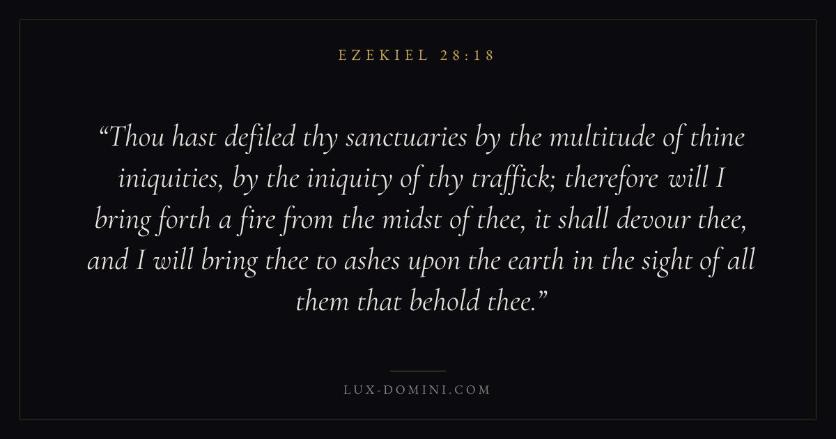 Thou hast defiled thy sanctuaries by the multitude of thine iniquities, by the iniquity of thy traffick; therefore will I bring forth a fire from the midst of thee, it shall devour thee, and I will bring thee to ashes upon the earth in the sight of all them that behold thee.