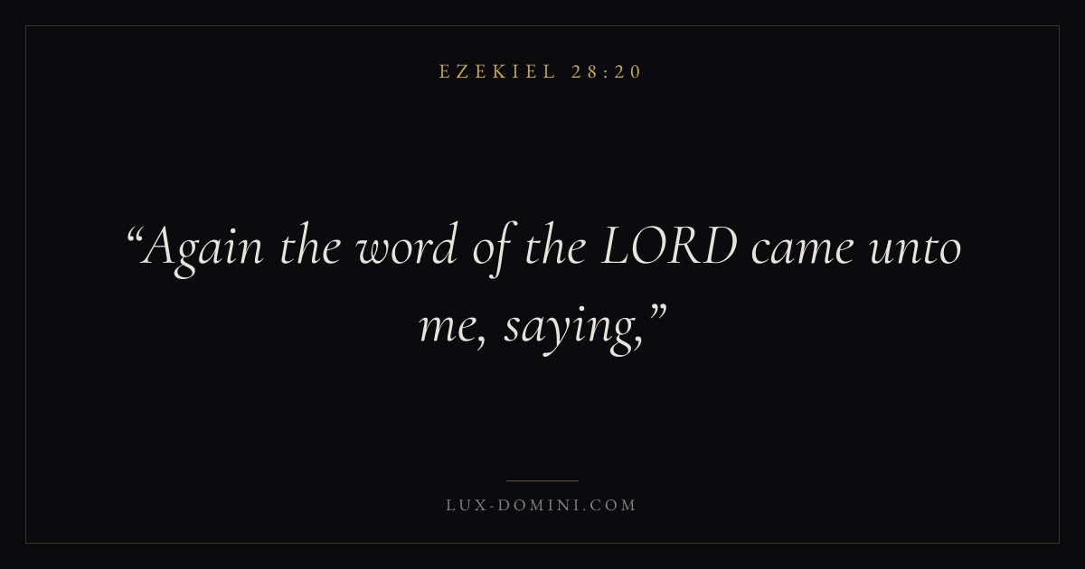 Books / Ezekiel / Chapter 28 / Verse 20 ← Ezekiel 28:19 Ezekiel 28:20 Ezekiel 28:21 → Again the word of the LORD came unto me, saying, Download verse card Share on Twitter Share on Facebook Pin it ✦ Key themes Justice and mercyTruthGlory of GodJudgment Read with Ezekiel 28:21Ezekiel 28:22Micah 6:8Amos 5:24 Related topics Bible verses about justice and mercyBible verses about truth ✦ Ezekiel Chapter 28 verses V. 1 V. 2 V. 3 V. 4 V. 5 V. 6 V. 7 V. 8 V. 9 V. 10 V. 11 V. 12 V. 13 V. 14 V. 15 V. 16 V. 17 V. 18 V. 19 V. 20 V. 21 V. 22 V. 23 V. 24 V. 25 V. 26