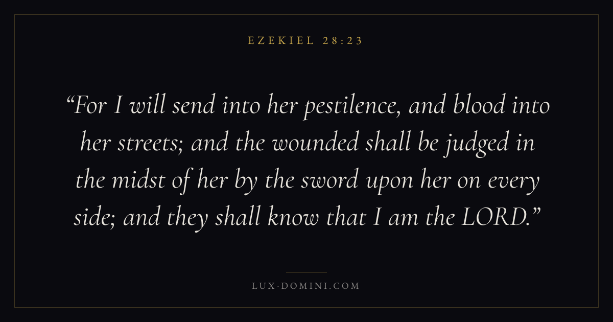 For I will send into her pestilence, and blood into her streets; and the wounded shall be judged in the midst of her by the sword upon her on every side; and they shall know that I am the LORD.