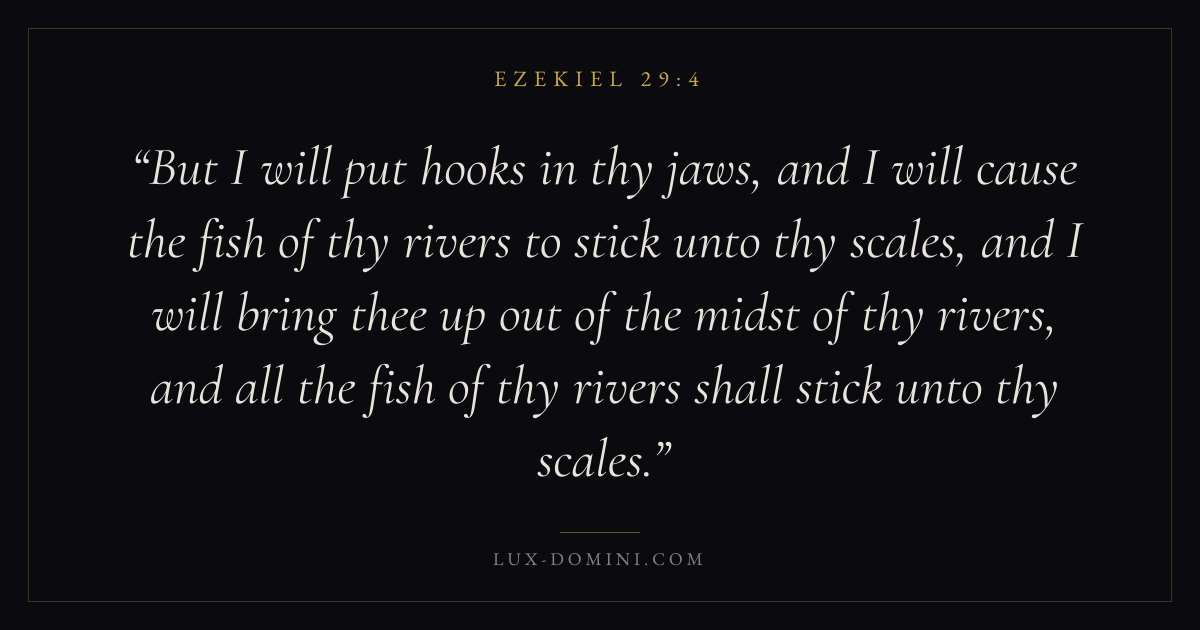 But I will put hooks in thy jaws, and I will cause the fish of thy rivers to stick unto thy scales, and I will bring thee up out of the midst of thy rivers, and all the fish of thy rivers shall stick unto thy scales.