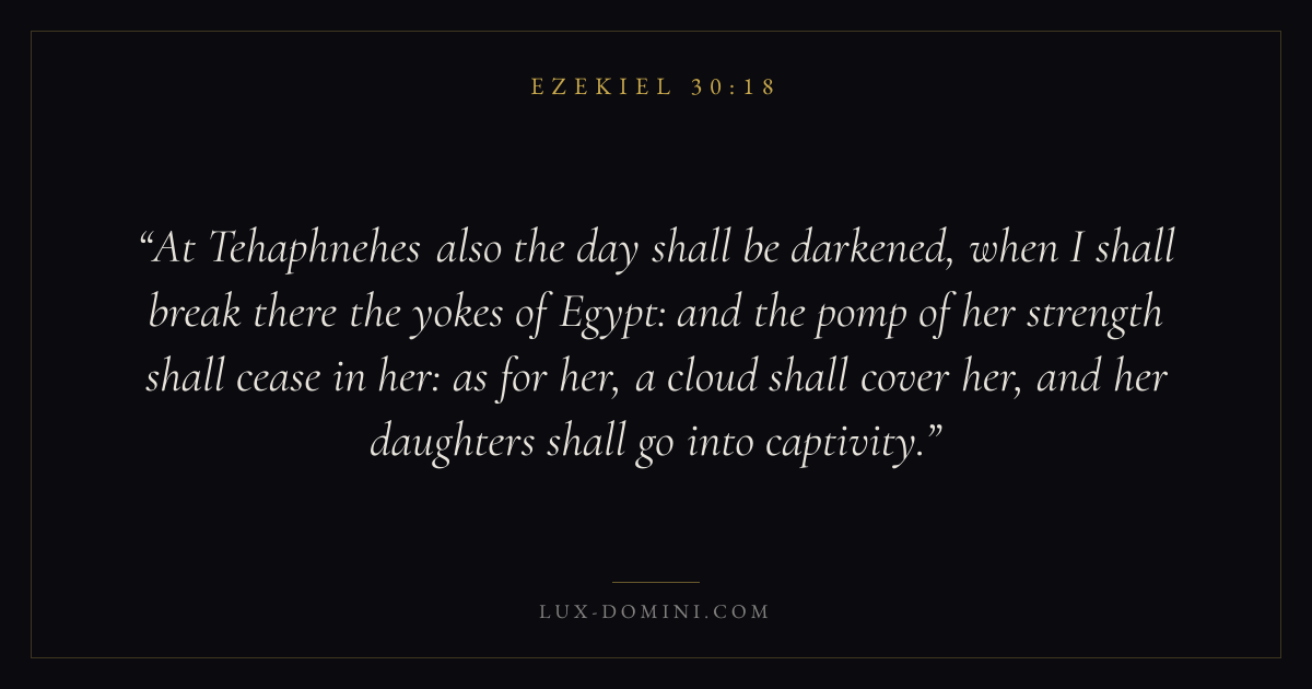 At Tehaphnehes also the day shall be darkened, when I shall break there the yokes of Egypt: and the pomp of her strength shall cease in her: as for her, a cloud shall cover her, and her daughters shall go into captivity.