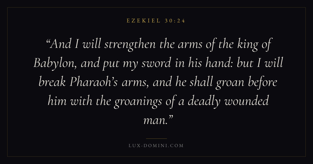 And I will strengthen the arms of the king of Babylon, and put my sword in his hand: but I will break Pharaoh’s arms, and he shall groan before him with the groanings of a deadly wounded man.