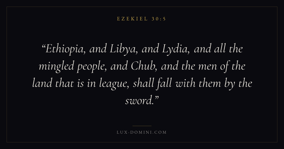 Ethiopia, and Libya, and Lydia, and all the mingled people, and Chub, and the men of the land that is in league, shall fall with them by the sword.