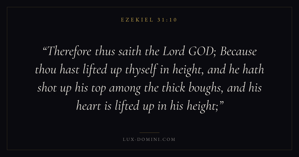 Therefore thus saith the Lord GOD; Because thou hast lifted up thyself in height, and he hath shot up his top among the thick boughs, and his heart is lifted up in his height;