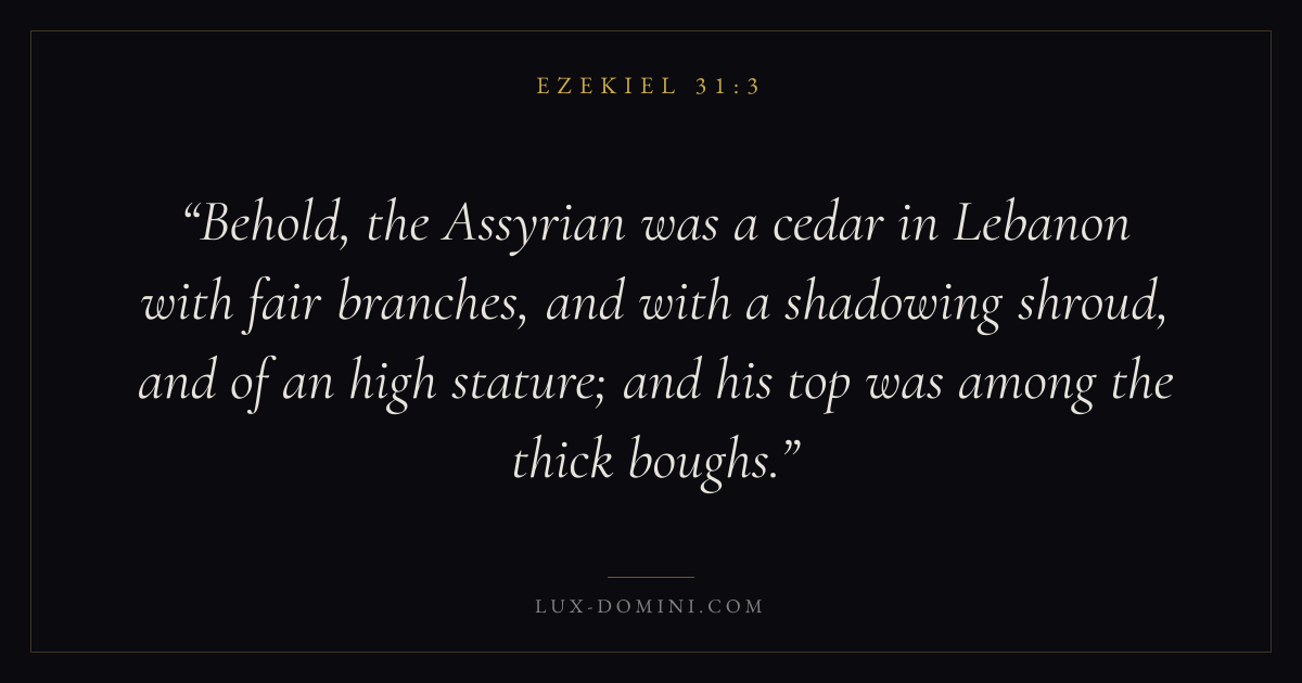 Behold, the Assyrian was a cedar in Lebanon with fair branches, and with a shadowing shroud, and of an high stature; and his top was among the thick boughs.