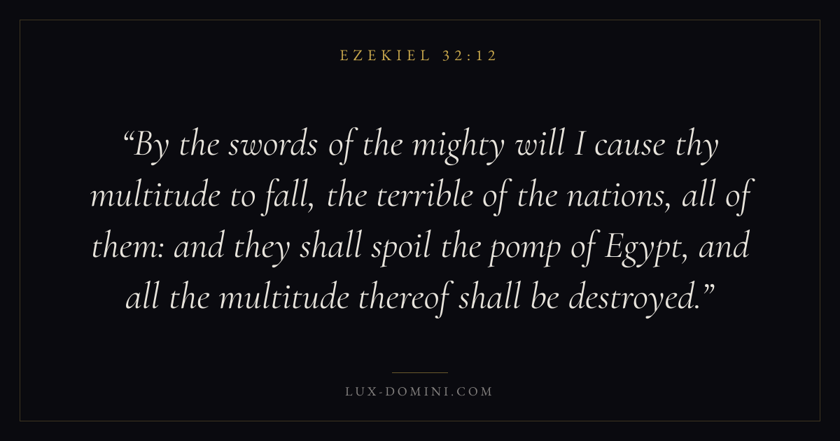 By the swords of the mighty will I cause thy multitude to fall, the terrible of the nations, all of them: and they shall spoil the pomp of Egypt, and all the multitude thereof shall be destroyed.
