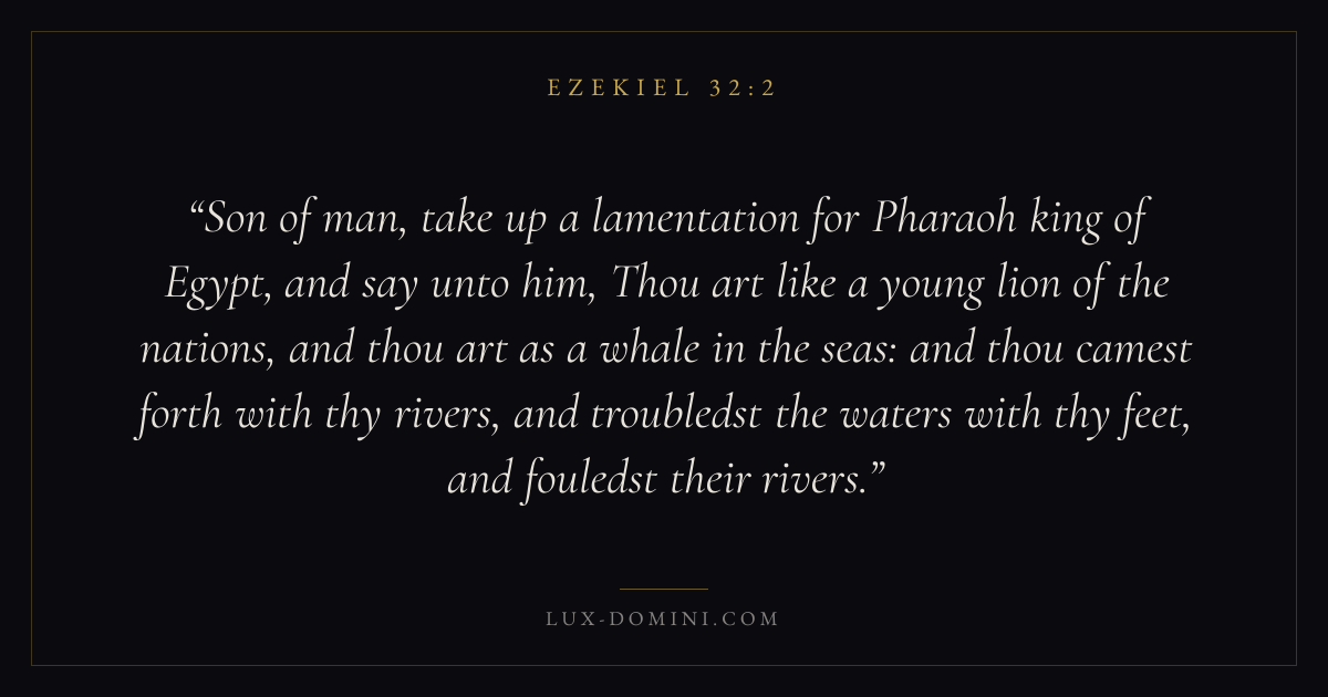 Son of man, take up a lamentation for Pharaoh king of Egypt, and say unto him, Thou art like a young lion of the nations, and thou art as a whale in the seas: and thou camest forth with thy rivers, and troubledst the waters with thy feet, and fouledst their rivers.