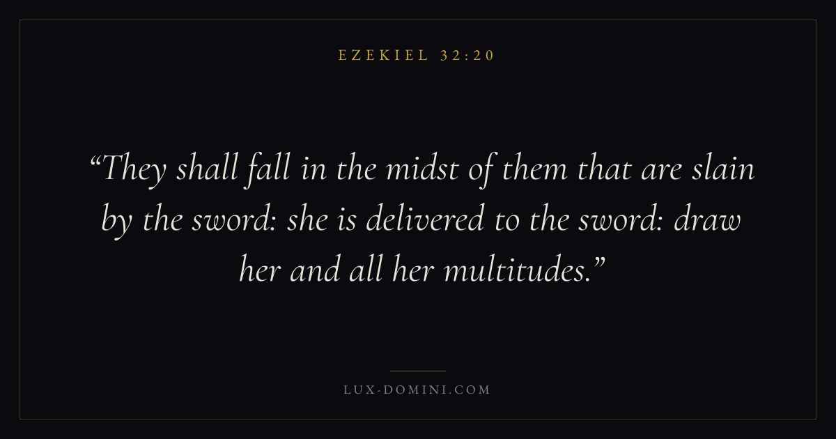 They shall fall in the midst of them that are slain by the sword: she is delivered to the sword: draw her and all her multitudes.