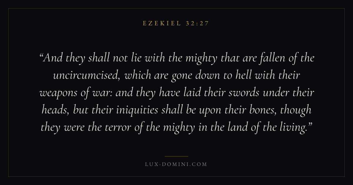 And they shall not lie with the mighty that are fallen of the uncircumcised, which are gone down to hell with their weapons of war: and they have laid their swords under their heads, but their iniquities shall be upon their bones, though they were the terror of the mighty in the land of the living.