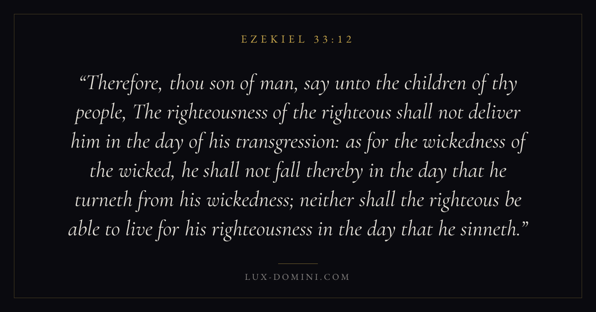 Therefore, thou son of man, say unto the children of thy people, The righteousness of the righteous shall not deliver him in the day of his transgression: as for the wickedness of the wicked, he shall not fall thereby in the day that he turneth from his wickedness; neither shall the righteous be able to live for his righteousness in the day that he sinneth.