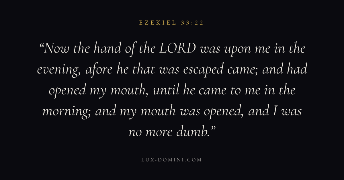 Now the hand of the LORD was upon me in the evening, afore he that was escaped came; and had opened my mouth, until he came to me in the morning; and my mouth was opened, and I was no more dumb.