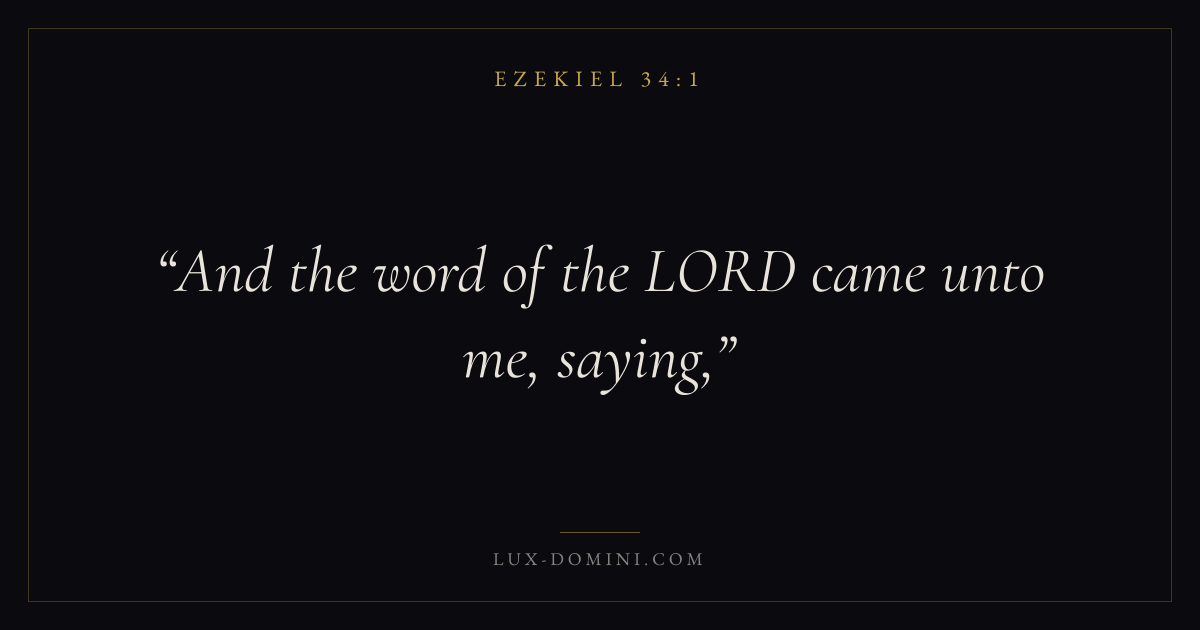 Books / Ezekiel / Chapter 34 / Verse 1 ← Ezekiel 33:33 Ezekiel 34:1 Ezekiel 34:2 → And the word of the LORD came unto me, saying, Download verse card Share on Twitter Share on Facebook Pin it ✦ Key themes FaithJustice and mercyTruthGlory of God Read with Ezekiel 34:2Ezekiel 34:3Hebrews 11:1Romans 10:17 Related topics Bible verses about faithBible verses about justice and mercyBible verses about truth ✦ Ezekiel Chapter 34 verses V. 1 V. 2 V. 3 V. 4 V. 5 V. 6 V. 7 V. 8 V. 9 V. 10 V. 11 V. 12 V. 13 V. 14 V. 15 V. 16 V. 17 V. 18 V. 19 V. 20 V. 21 V. 22 V. 23 V. 24 V. 25 V. 26 V. 27 V. 28 V. 29 V. 30 V. 31