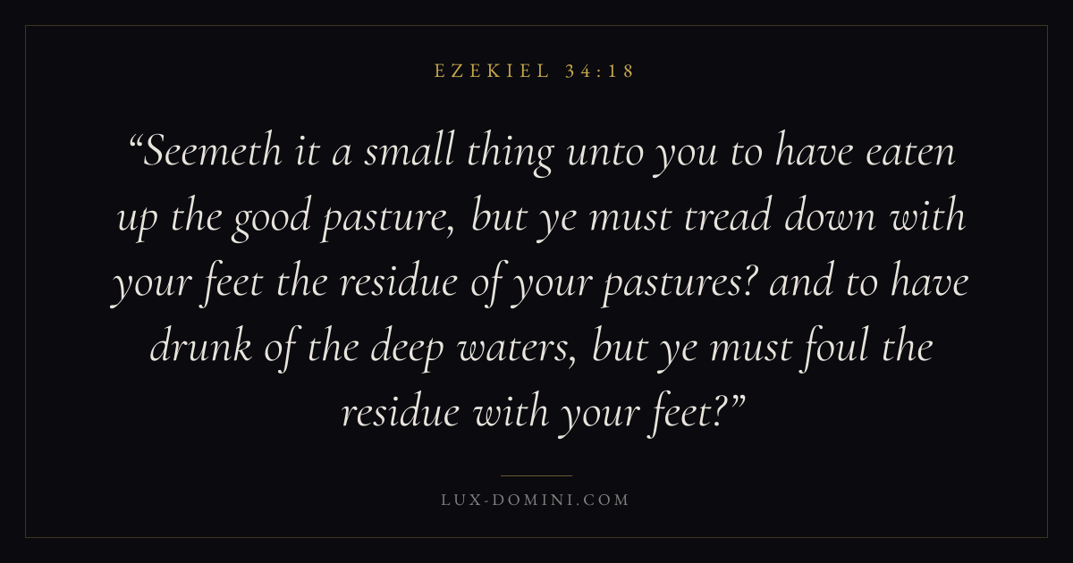 Seemeth it a small thing unto you to have eaten up the good pasture, but ye must tread down with your feet the residue of your pastures? and to have drunk of the deep waters, but ye must foul the residue with your feet?