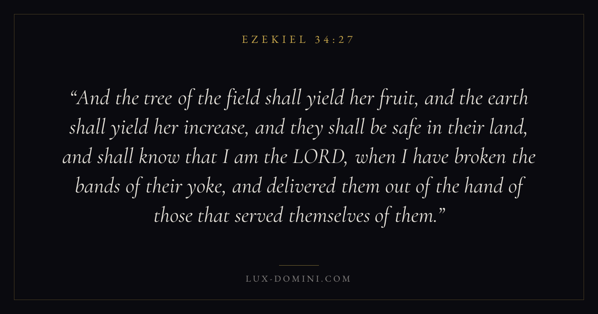 And the tree of the field shall yield her fruit, and the earth shall yield her increase, and they shall be safe in their land, and shall know that I am the LORD, when I have broken the bands of their yoke, and delivered them out of the hand of those that served themselves of them.