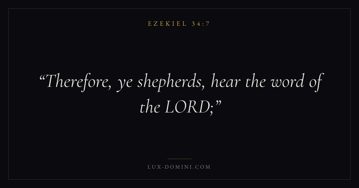 Books / Ezekiel / Chapter 34 / Verse 7 ← Ezekiel 34:6 Ezekiel 34:7 Ezekiel 34:8 → Therefore, ye shepherds, hear the word of the LORD; Download verse card Share on Twitter Share on Facebook Pin it ✦ Key themes Justice and mercyTruthGlory of GodJudgment Read with Ezekiel 34:8Ezekiel 34:9Micah 6:8Amos 5:24 Related topics Bible verses about justice and mercyBible verses about truth ✦ Ezekiel Chapter 34 verses V. 1 V. 2 V. 3 V. 4 V. 5 V. 6 V. 7 V. 8 V. 9 V. 10 V. 11 V. 12 V. 13 V. 14 V. 15 V. 16 V. 17 V. 18 V. 19 V. 20 V. 21 V. 22 V. 23 V. 24 V. 25 V. 26 V. 27 V. 28 V. 29 V. 30 V. 31