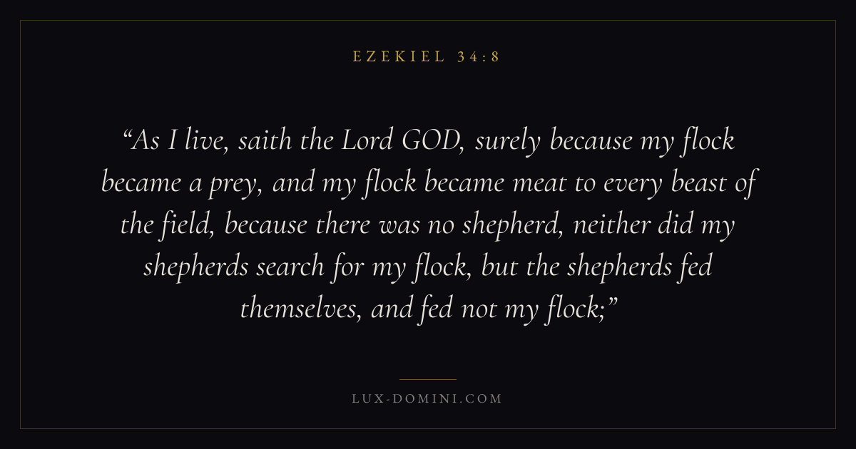 As I live, saith the Lord GOD, surely because my flock became a prey, and my flock became meat to every beast of the field, because there was no shepherd, neither did my shepherds search for my flock, but the shepherds fed themselves, and fed not my flock;