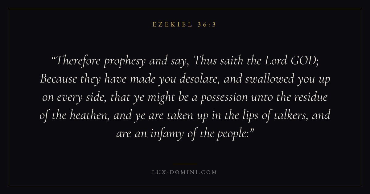 Therefore prophesy and say, Thus saith the Lord GOD; Because they have made you desolate, and swallowed you up on every side, that ye might be a possession unto the residue of the heathen, and ye are taken up in the lips of talkers, and are an infamy of the people: