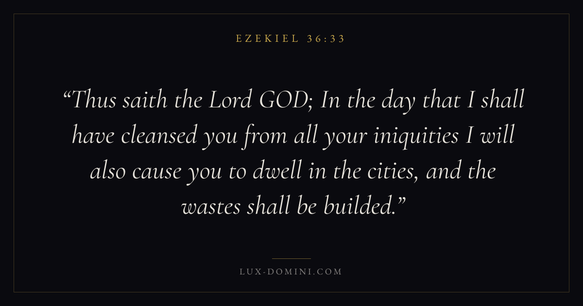 Thus saith the Lord GOD; In the day that I shall have cleansed you from all your iniquities I will also cause you to dwell in the cities, and the wastes shall be builded.